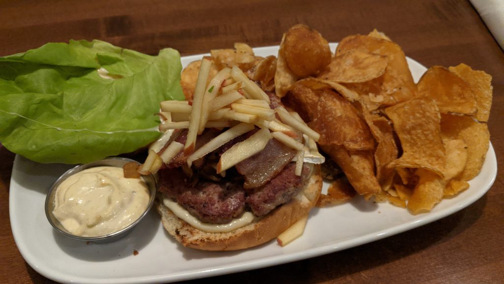 The wild hog burger — ok, ok, pork burger — came loaded with spiced apples, thick cut bacon, and heaps of brie cheese. We were impressed with how much was included – particularly the brie, which is not a cheap item. The toppings, and the pork and bacon patty they were heaped over, all sat in a bed of garlic aioli on a toasty bun. Butter lettuce accompanied the top half.