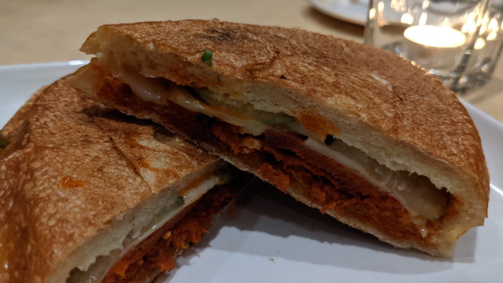 Lastly came the chorizo Cuban sandwich. Cubanos are a big hit in our household so we knew we had to give this a try. The menu gives the impression you’re getting a hearty Cuban sandwich, but it’s actually more like a panini, albeit with much of the same contents of the Cuban. The roasted pork has been swapped for spicy chorizo, and the pickles aren’t quite as pronounced as you might expect.
