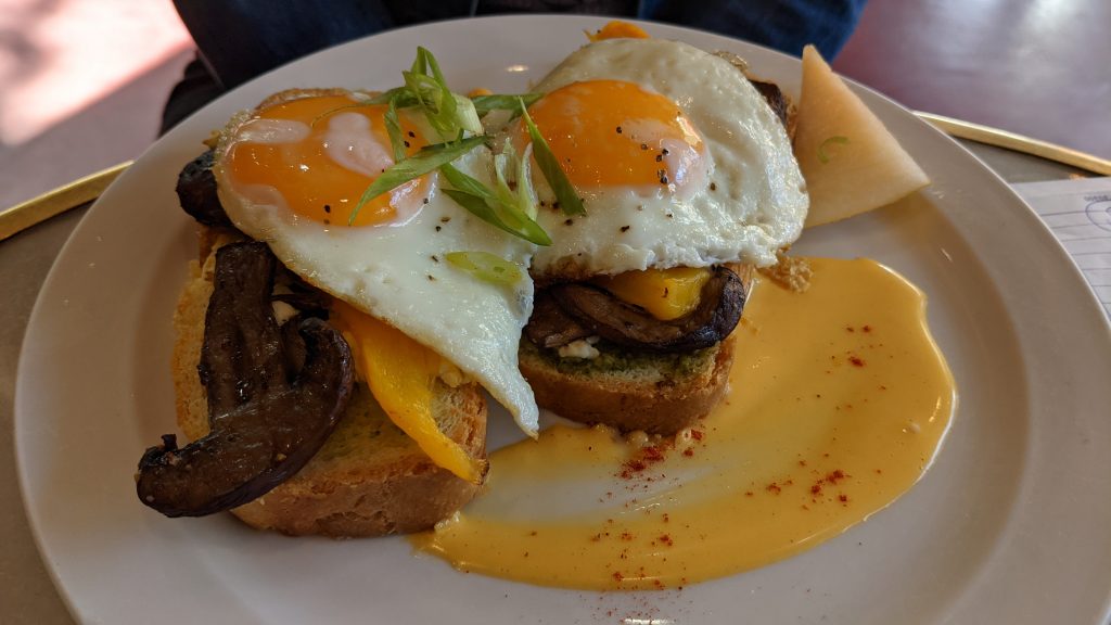 While our breakfasts sound different, they were actually quite similar. For her, the breakfast strata – essentially brioche toast stacked with vegetables, a couple of sunny-side eggs, and hollandaise. For him, the croque madame – a brioche sandwich with bacon and cheese, a couple of sunny-side eggs on top, and hollandaise.
