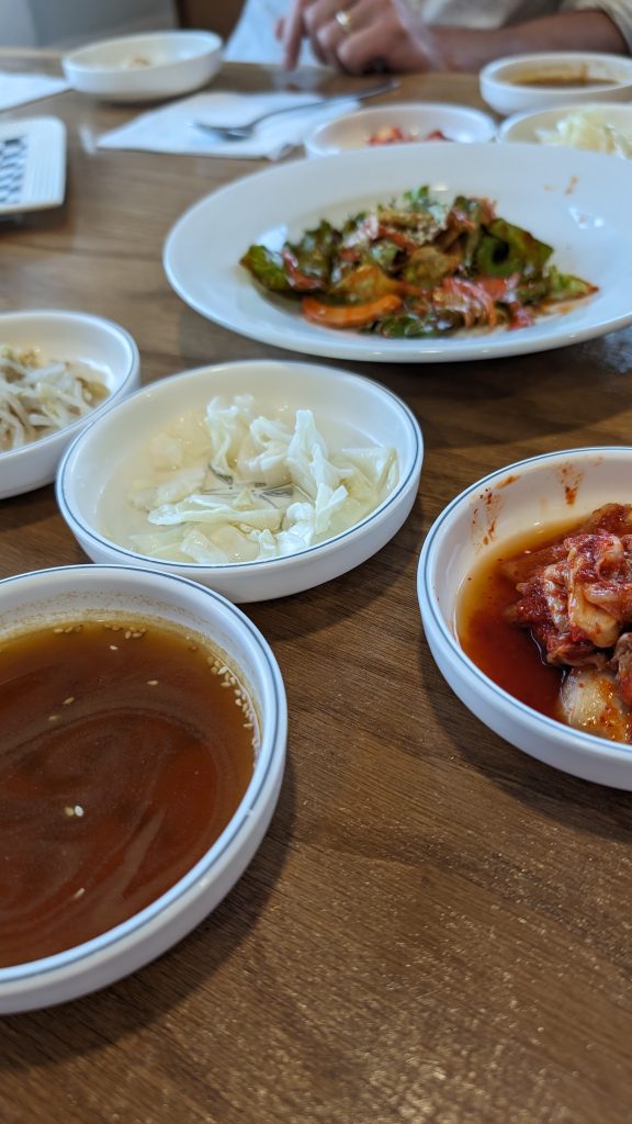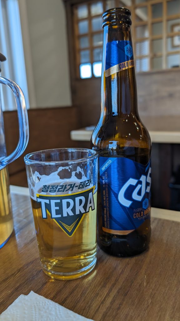 Normally when we have Korean, we also like to have soju, but for whatever reason we passed that up tonight. We were keen to try one of the Korean beers we’d never had before and the restaurant had two: Cass, and Terra, both lagers. Over the course of the evening we tried both. The server asked our preference and all four of us preferred the Cass. The server then told us Terra was popular with young people. Ouch, lol.