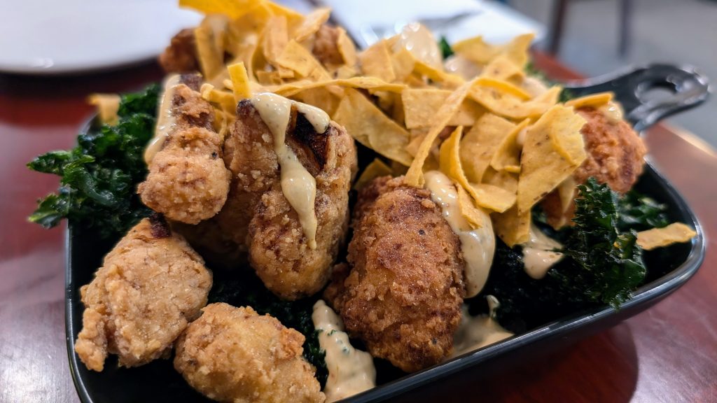 The crispy cauliflower arrived in a (plastic?) skillet on a bed of quick-fried kale and topped with crispy tortillas and chipotle aioli. While it didn’t look all that special, just a few bites in we knew we had a winner. The cauliflower was breaded nicely and had a perfect balance of crispy outside and soft veg on the inside. The aioli was not overapplied so there was just enough to add creaminess to each bite without it feeling like a mouth full of mayonnaise. The kale was fun to eat, if a touch oily, and the tortillas added plenty of texture. We really like this simple dish and would order it again.
