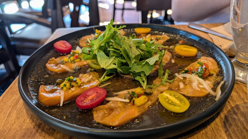 For mains we shared the lettuce wraps, salmon carpaccio, and the spicy chicken burger. The wraps came with glazed chicken bits, onions, fried yam strings and a couple choices of sauce. These were tasty and fun to eat. The salmon carpaccio was a pleasant surprise, nicely presented but also delicious (although putting capers on food is like a cheat code to get our approval).