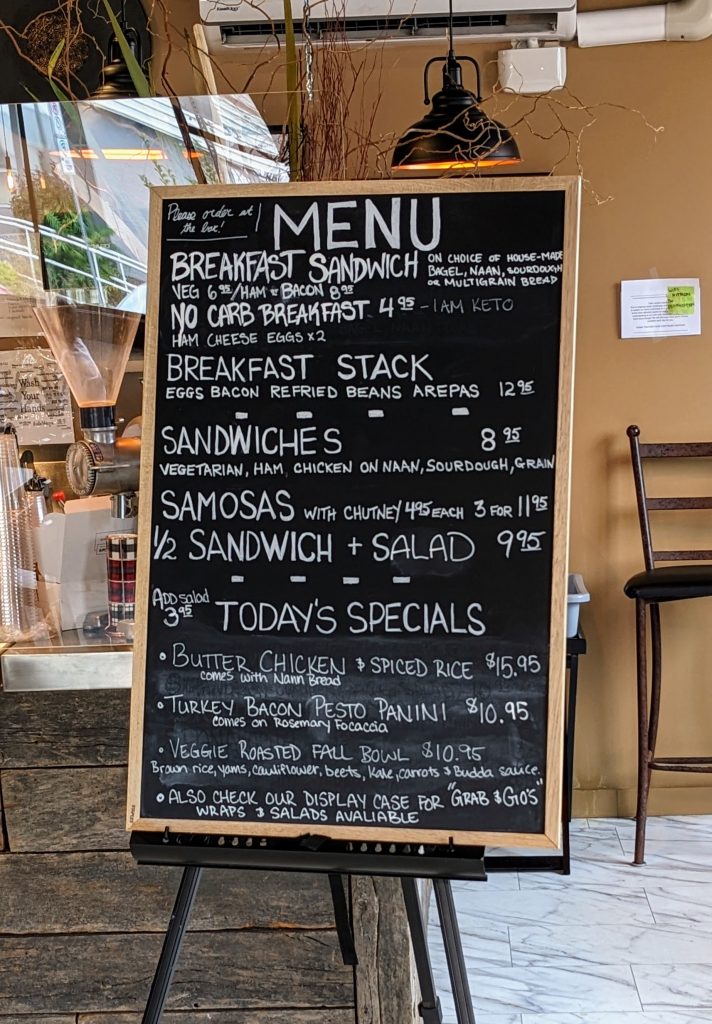 In addition to the standard array of baked goods (muffins, scones, Nanaimo bars, etc.) this café has a few Indian items on the menu. It’s not quite as exotic a menu offering as we’d hoped based on their motto (“foods from cultures near and far“) but it’s still different enough to be compelling. The promise of different daily entrée specials intrigues too.