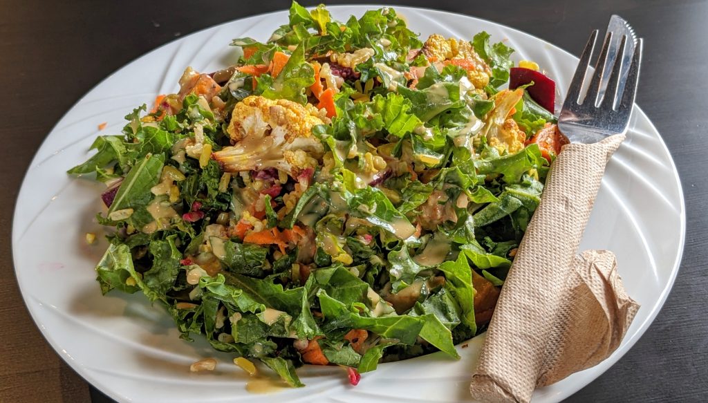 The special we ordered was a “veggie roasted Fall bowl”. We weren’t sure what “roasted Fall” was but wanted to try it anyway. 😉 This dish was essentially a kale salad served on rice, with a few roasted veggies thrown in. The salad itself was great and we particularly liked the dressing. As with the other entrée, though, the rice was a bit on the dry side.